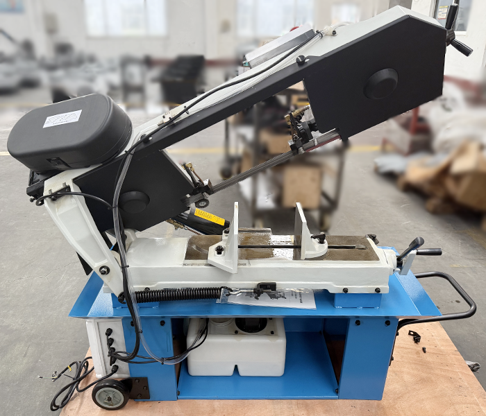 | Equipment Application | The BS-912B is a horizontal metal cutting band saw designed for small and medium-sized machining applications. Its lightweight, flexible, and versatile adaptability make it widely suitable for small fabrication workshops, repair shops, teaching labs, and personal hobby studios. The “BS” in its model number represents the band saw type, and its core specifications meet the needs of general metal cutting: It can handle Φ229mm (9″) round workpieces and 178×305mm (7″×12″) rectangular workpieces at 90° vertical cutting, and Φ150mm (6″) round workpieces and 127×150mm (5″×6″) rectangular workpieces at 45° bevel cutting. It is equipped with a 1.1kW (1.5HP) motor and supports single and three-phase power input. Select models offer dual voltage switching between 115V and 230V, allowing deployment without specialized power equipment. The overall dimensions of the machine are only 1540×590×1150mm, with a net weight of 230kg. It is equipped with universal wheels on the base for flexible movement and can adapt to small workshops or multi-station rotation needs. | ||||