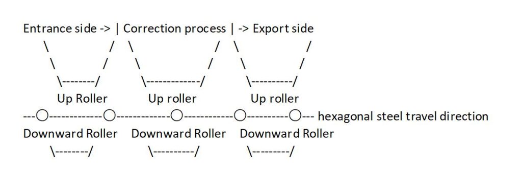 - When the hexagonal steel enters the rollers, it is forced to bend repeatedly in the opposite direction. As shown in the diagram, the middle roller pushes the steel upward, creating a “reverse bend” much larger than the original bend.